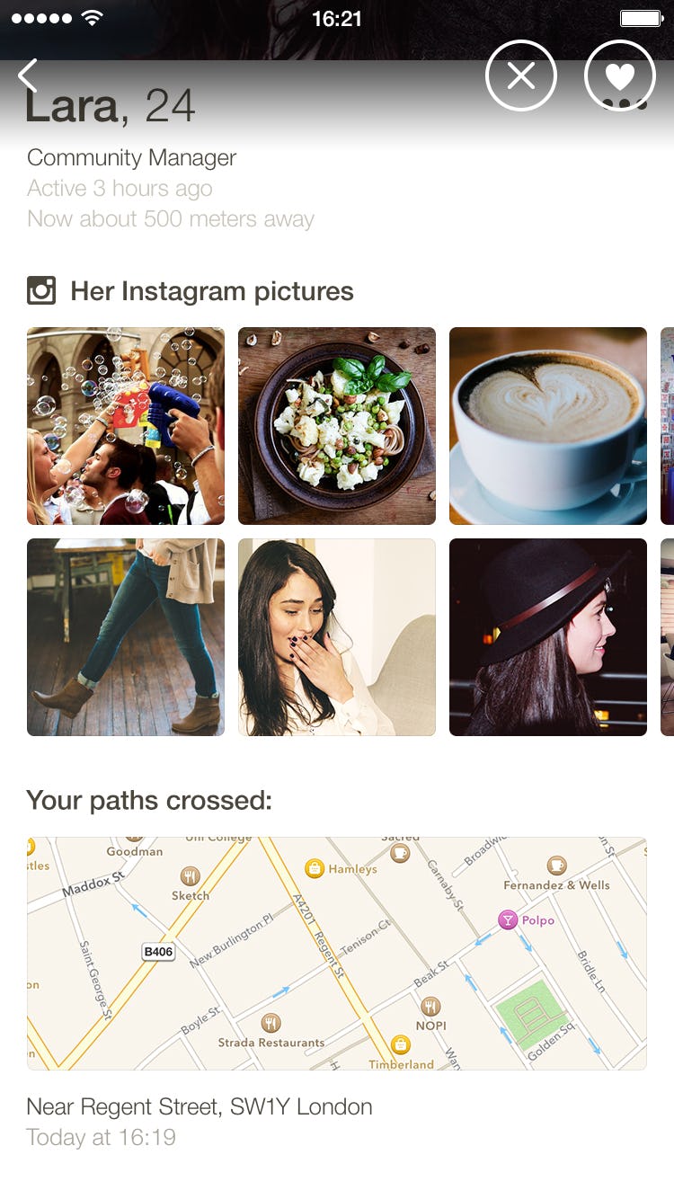 There is no control on where you can cross paths . Most such crossing happen far outside of dating range . It commits the Tinder fail of paper thin profiles . The one text box they give you even has a low character limit so even if you want to provide good information, you can't . Few users and even fewer are active .