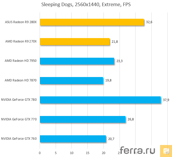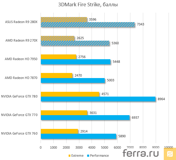 AMD Radeon R9 270X 2048Mb (1050/1450) - AMD Radeon R9 270X с номинальными частотами; AMD Radeon R9 270X 2048Mb (1150/1500) - AMD Radeon R9 270X с разгоном; Результаты тестирования видеокарты AMD Radeon R9 270X выделены голубым на диаграммах .
