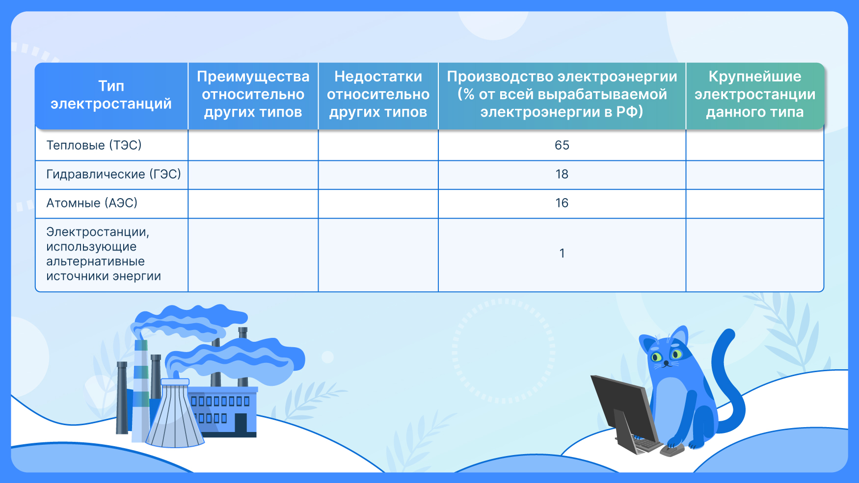 Характеристика электростанций разных видов таблица
