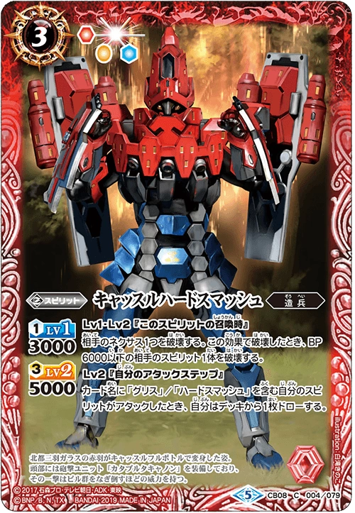 The Castle Hard Smash's Ground Rampart (γ°γ©γ³γγ©γ³γγΌγ Gurando RanpΔto) shoulder-mounted shields are capable of great defensive utility or ramming ability . The Castle Hard Smash can fire a green energy beam from the Catapulta Cannon (γ«γΏγγ«γΏγγ£γγ³ Katapuruta Kyanon) on its forehead .