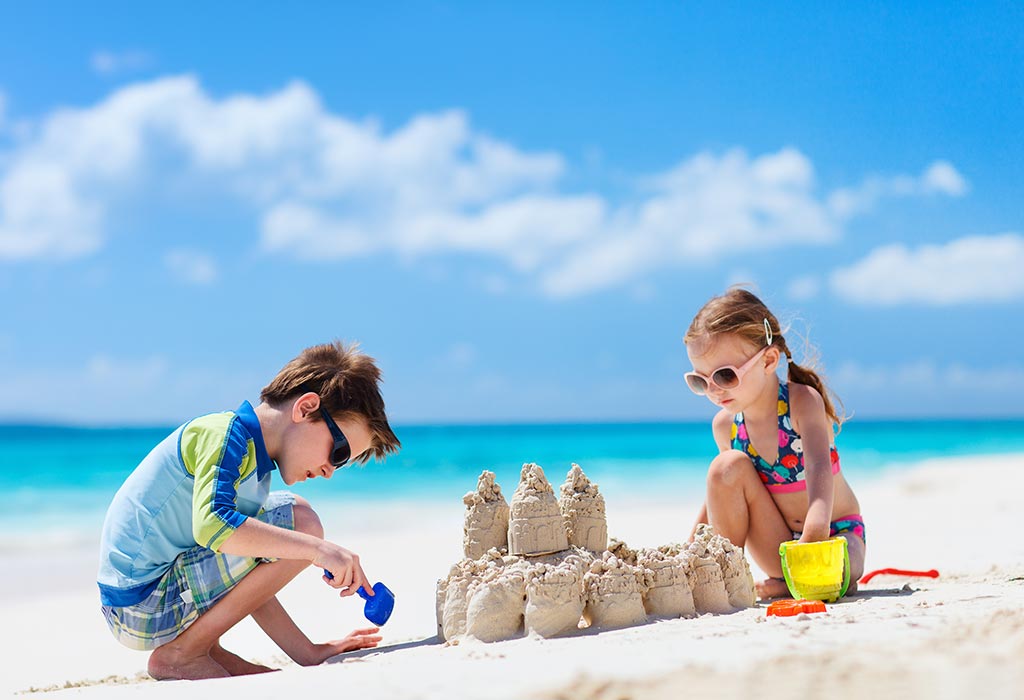 She's outside on the beach, making a sand castle.