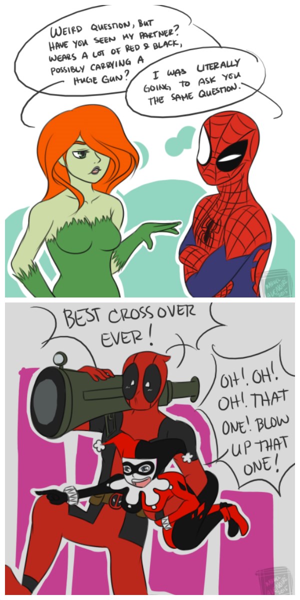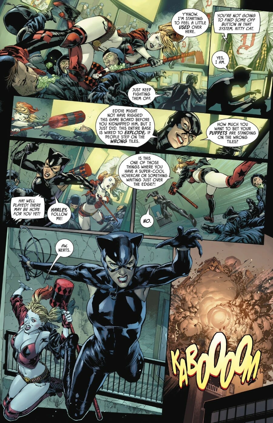 Batman angry over Harley Quinn nearly killing Robin Batman then engaged Harley in battle, who could barely escape capture from him, much less hold her own, and Batman soon gained the upper hand and prepared to handcuff her . However, at that moment Poison Ivy arrived and swarmed him with vines, suspending him in the air .