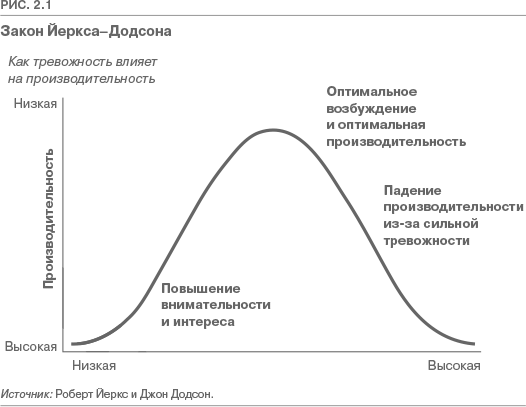 Давайте рассмотрим рис. 2.1. Согласно так называемому закону Йеркса–Додсона, производительность растет при физиологическом или мыслительном возбуждении (стрессе), но только до определенного уровня. Когда уровень стресса становится слишком высоким, производительность падает.