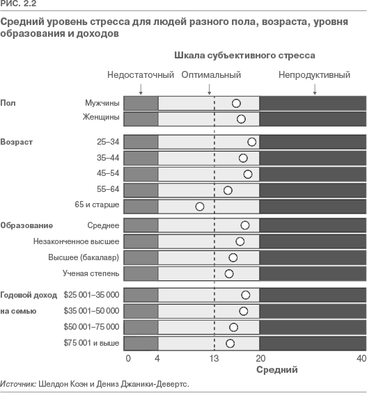 Но если вы набрали значительно больше или меньше баллов, то, скорее всего, уровень стресса вреден для вашей продуктивности. В частности, 20 и более баллов принято считать свидетельством непродуктивного уровня стресса. Но даже оценка, свидетельствующая о низком уровне стресса, — четыре и ниже — может представлять проблему: она сигнализирует о том, что ваш уровень возбуждения недостаточен для поддержания интереса к работе. В этом случае вам стоит прибегнуть к здоровому способу увеличения стресса, взяв на себя более ответственные обязательства и выразив готовность решить более сложные задачи. Повышение уровня стресса может показаться вам неправильным. Однако, согласно исследованиям Шелдона Коэна и Дениз Джаники-Девертс (опубликованным в Journal of Applied Social Psychology), повышение уровня возбуждения связано также с повышенным вниманием и интересом (до определенного предела).