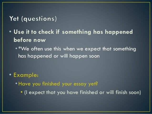 1,552 . Re: Did you finish yet ? In British English it is more normal to use the present perfect: " Have you finished yet ?" This is because the question links the past with the present, and that's when we use the present perfect . In American English the past simple -- "Did you finish yet ?" -- is quite common, at least in informal speech .