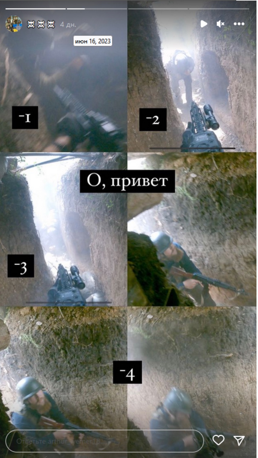 16 июня 2023 г. А.Хазан на своей странице в СС «Instagram» опубликовал пост с кадрами, записанными на его экшен-камеру, где он участвует в окопном бою и убивает 4 российских солдат (Фото 5).