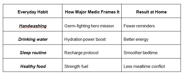 After bringing in Major Medic, we noticed our child started calling outdoor games “Hero Training” and danced to build stamina. We stopped pushing activity because they began choosing it.