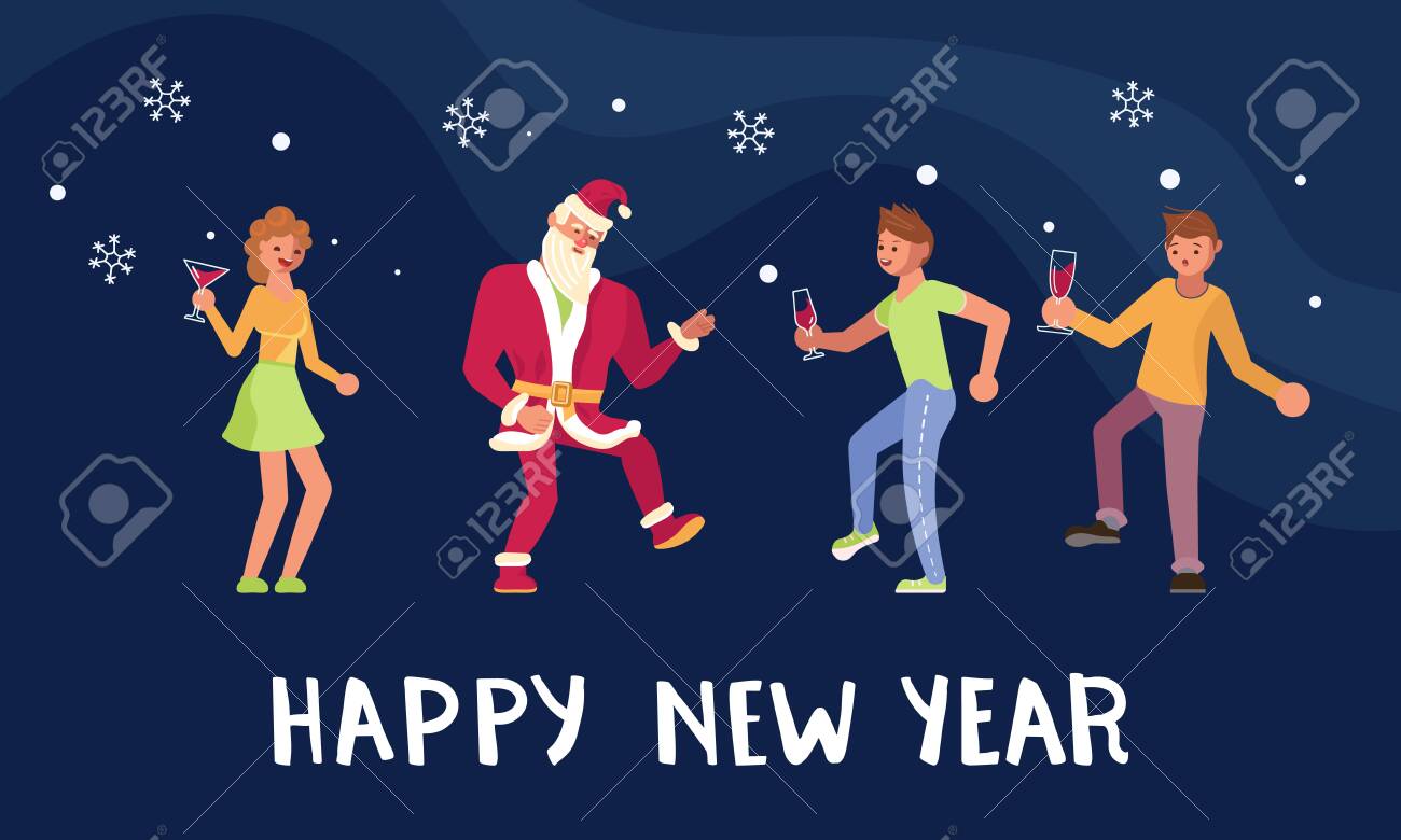 Santa Helpers Dancing And Showing Sign Happy New Year High . . .