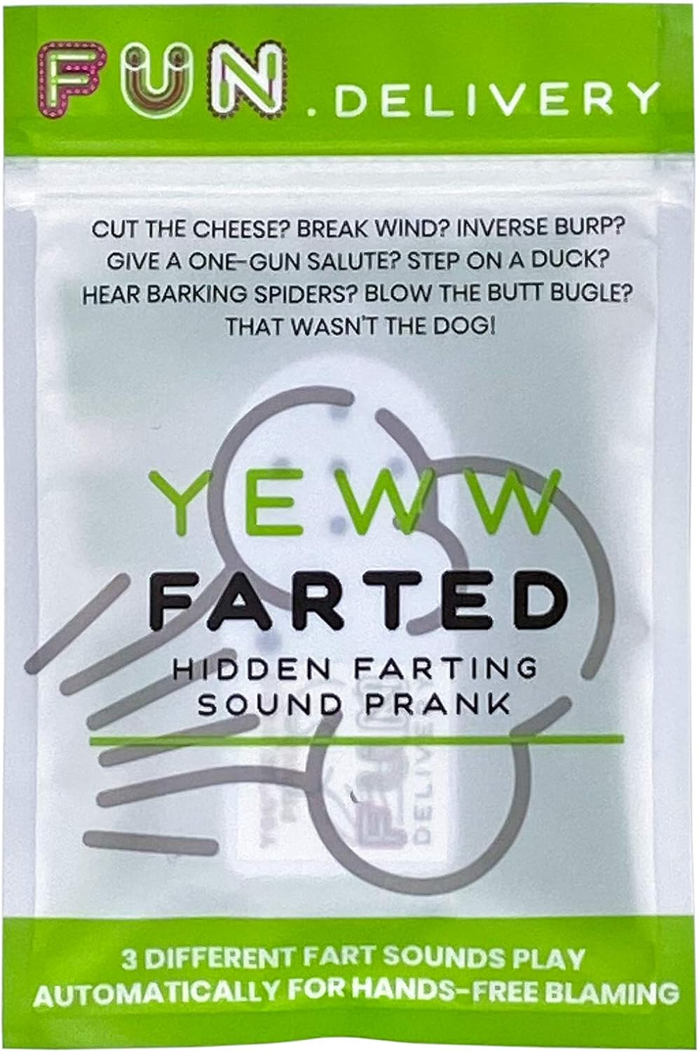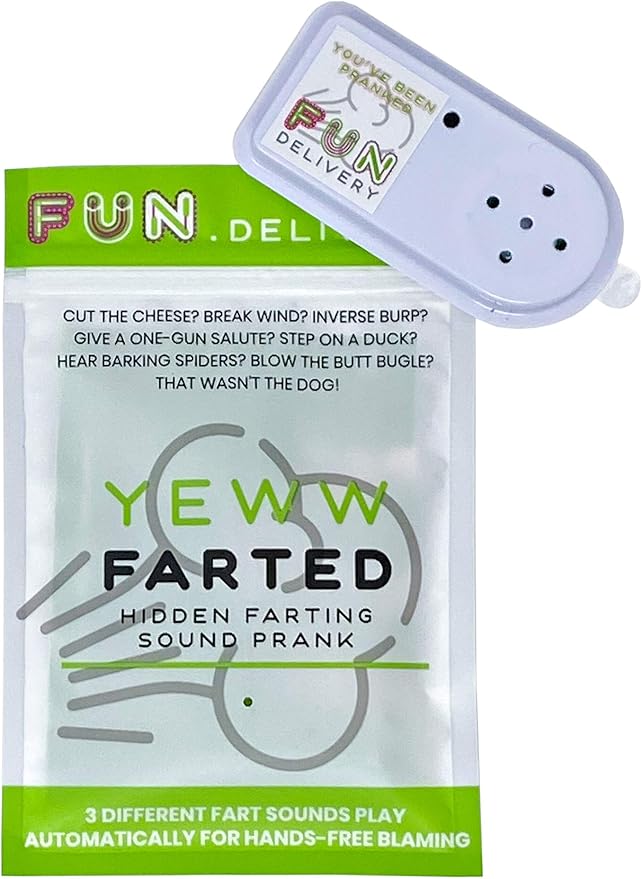 FUN delivery Yeww Farted: Hands Free Hidden Annoying Farting Joke Gag Prank Fart Sound . 3 .8 out of 5 stars 80 . $10 .99 $ 10 . 99 . Get it as soon as Thu, Apr 1 . FREE Shipping on orders over $25 shipped by Amazon . Ages: 3 months and up