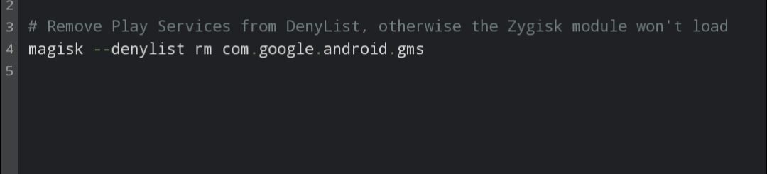 - jika google play services ada di denylist, maka modul-modul yang berbasis zygisk tidak dapat berfungsi. Berikut screenshot dari isi Universal Safetynet Fix yang menghapus gms dri denylist :