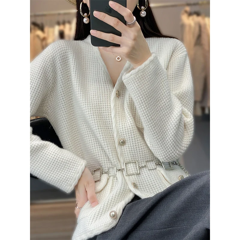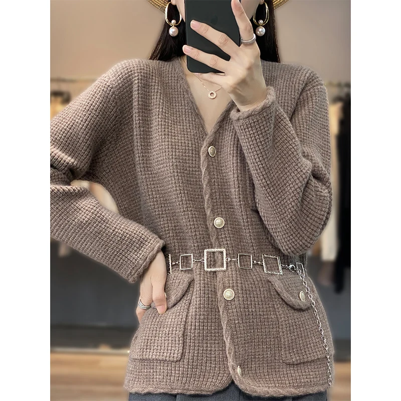«High-Quality Pure Wool Sweater Women's V-Neck Small Fragrance Knitted Cardigan Waffle Thickened Outer Wear Ins To Cover The Meat» по лучшей цене на рынке! Всего за 71$ (6745рублей)