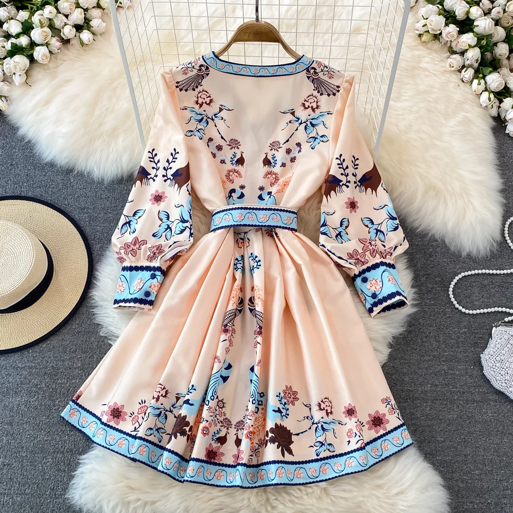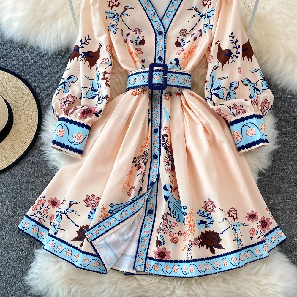 «High Quality Spring Summer Vintage Short Dress Female's V Neck Lantern Sleeve Flower Print Mini Party Dresses with Belt M62110» по лучшей цене на рынке! Всего за 26$ (2470рублей)