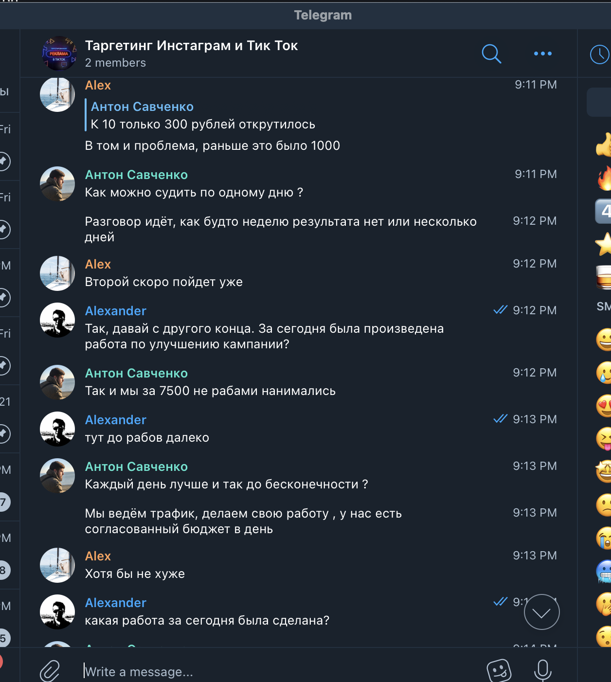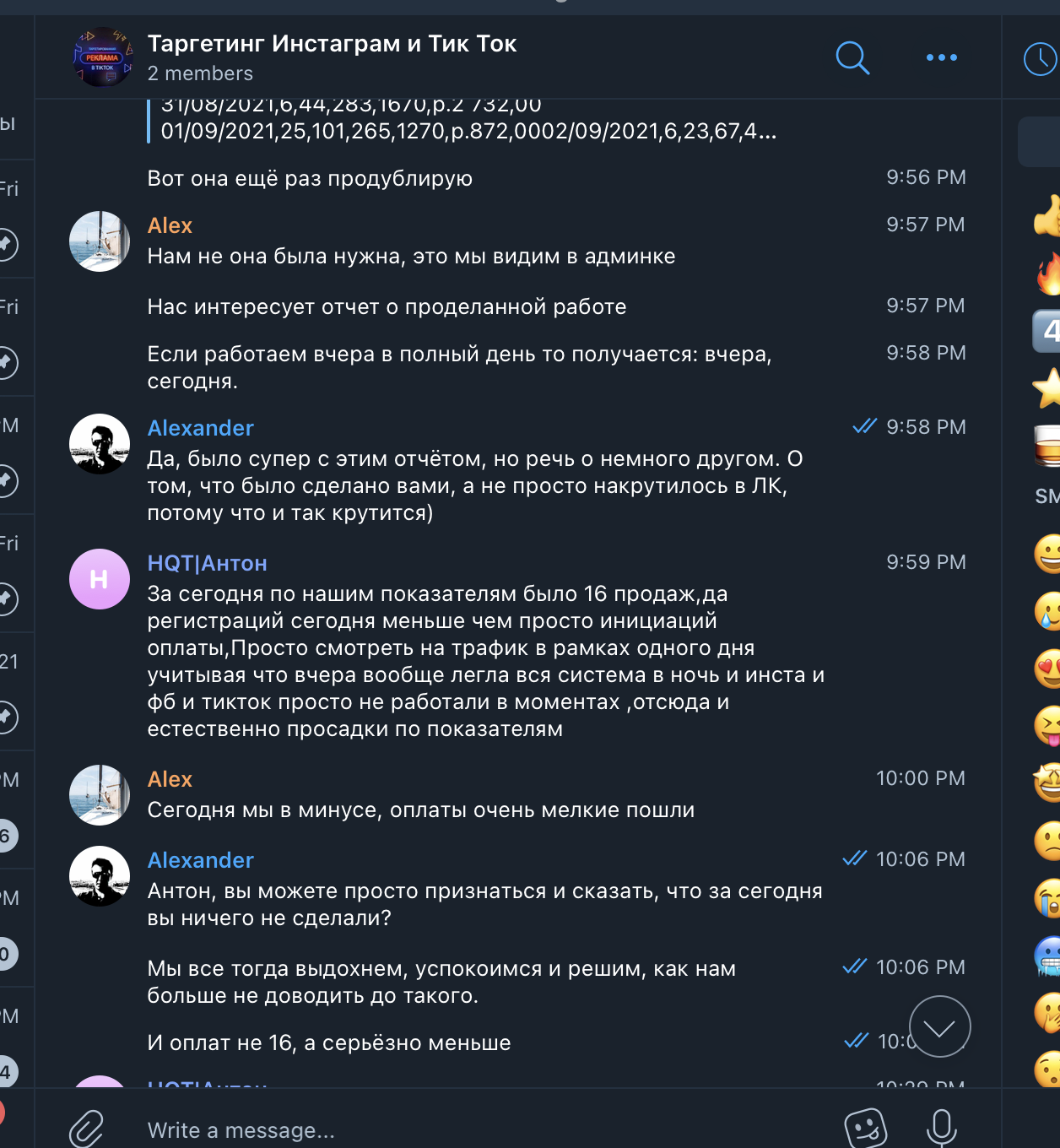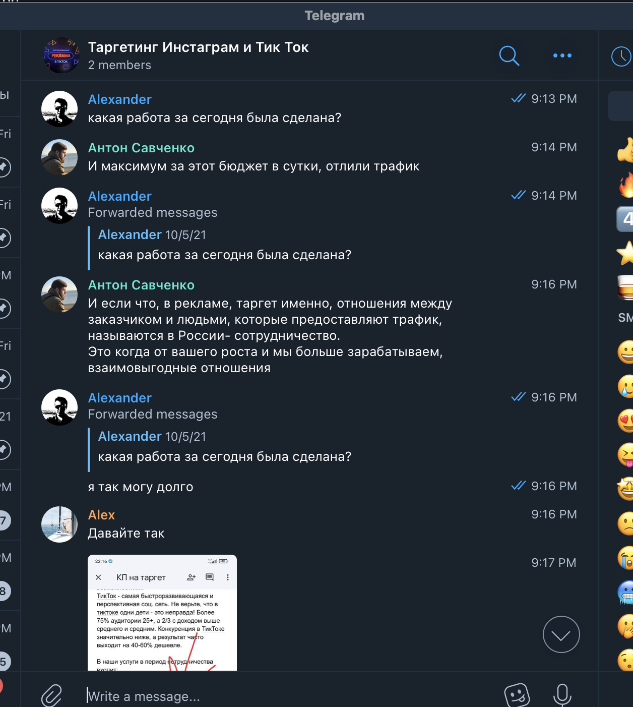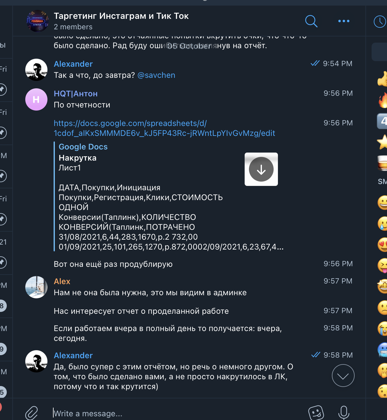 Мы создали общий чат в Телеграме, договорились на звонок, и в скором времени его провели. Посколько мы сами работаем в сфере SMM, мы сразу обозначили свой интерес – нам надо и для себя, и для наших клиентов, если это эффективно. Понравилось ещё и то, что они не просили предоплату и предоставляли первую неделю работы на тест. Впрочем, это условие пришлось выбить, но главное же итог, не так ли?