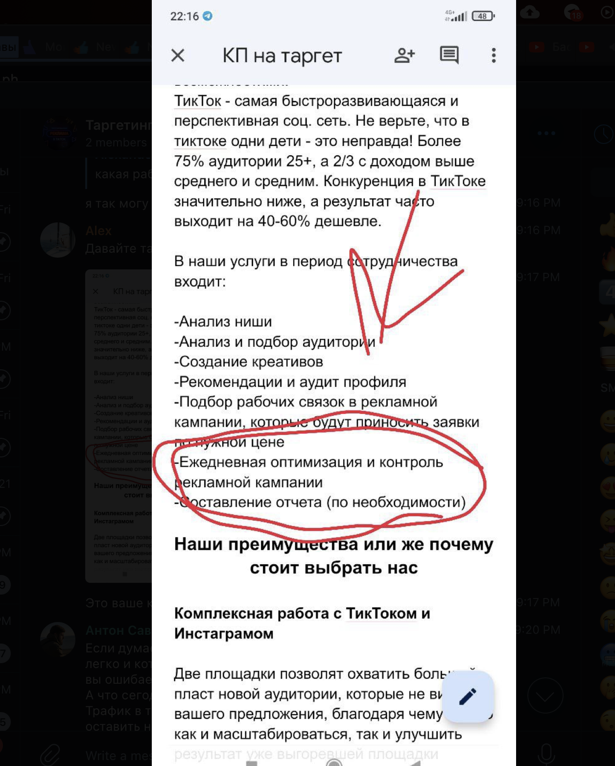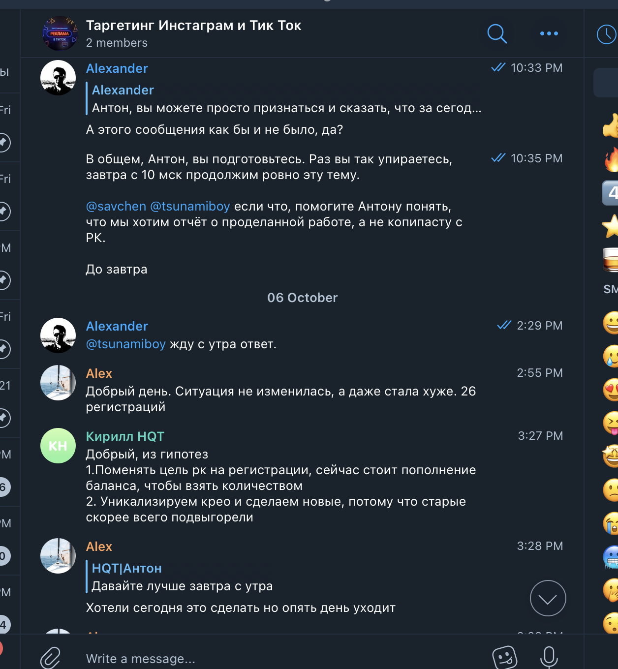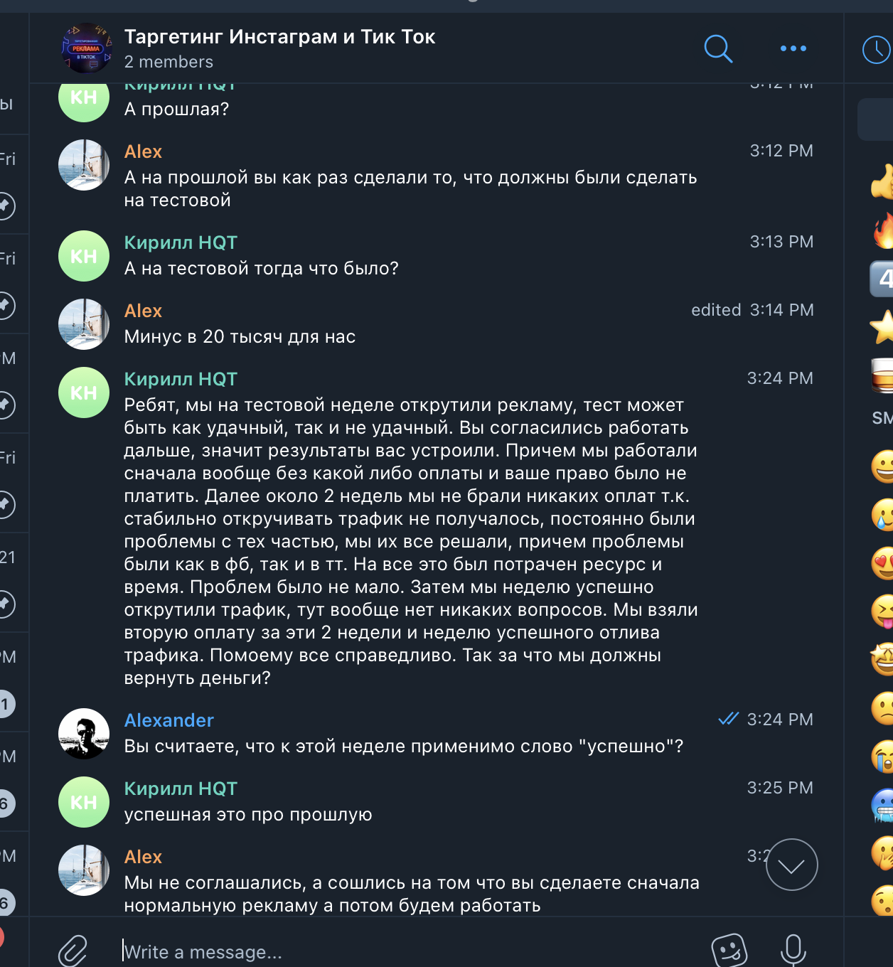 Мы создали общий чат в Телеграме, договорились на звонок, и в скором времени его провели. Посколько мы сами работаем в сфере SMM, мы сразу обозначили свой интерес – нам надо и для себя, и для наших клиентов, если это эффективно. Понравилось ещё и то, что они не просили предоплату и предоставляли первую неделю работы на тест. Впрочем, это условие пришлось выбить, но главное же итог, не так ли?