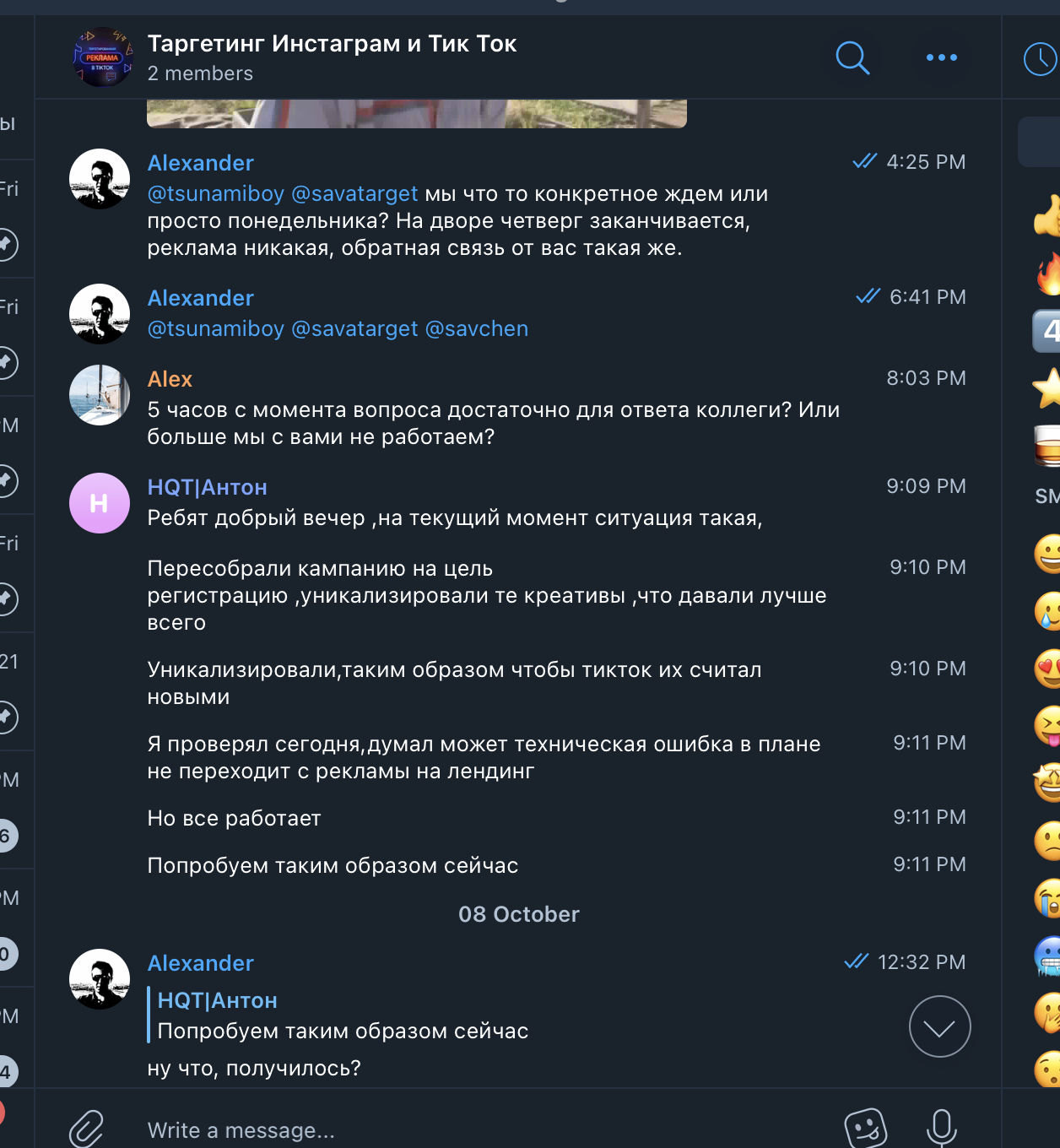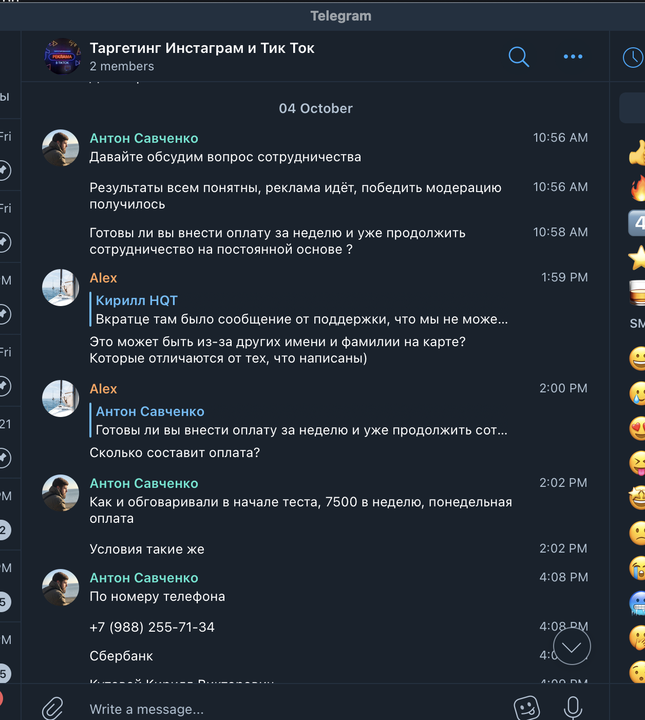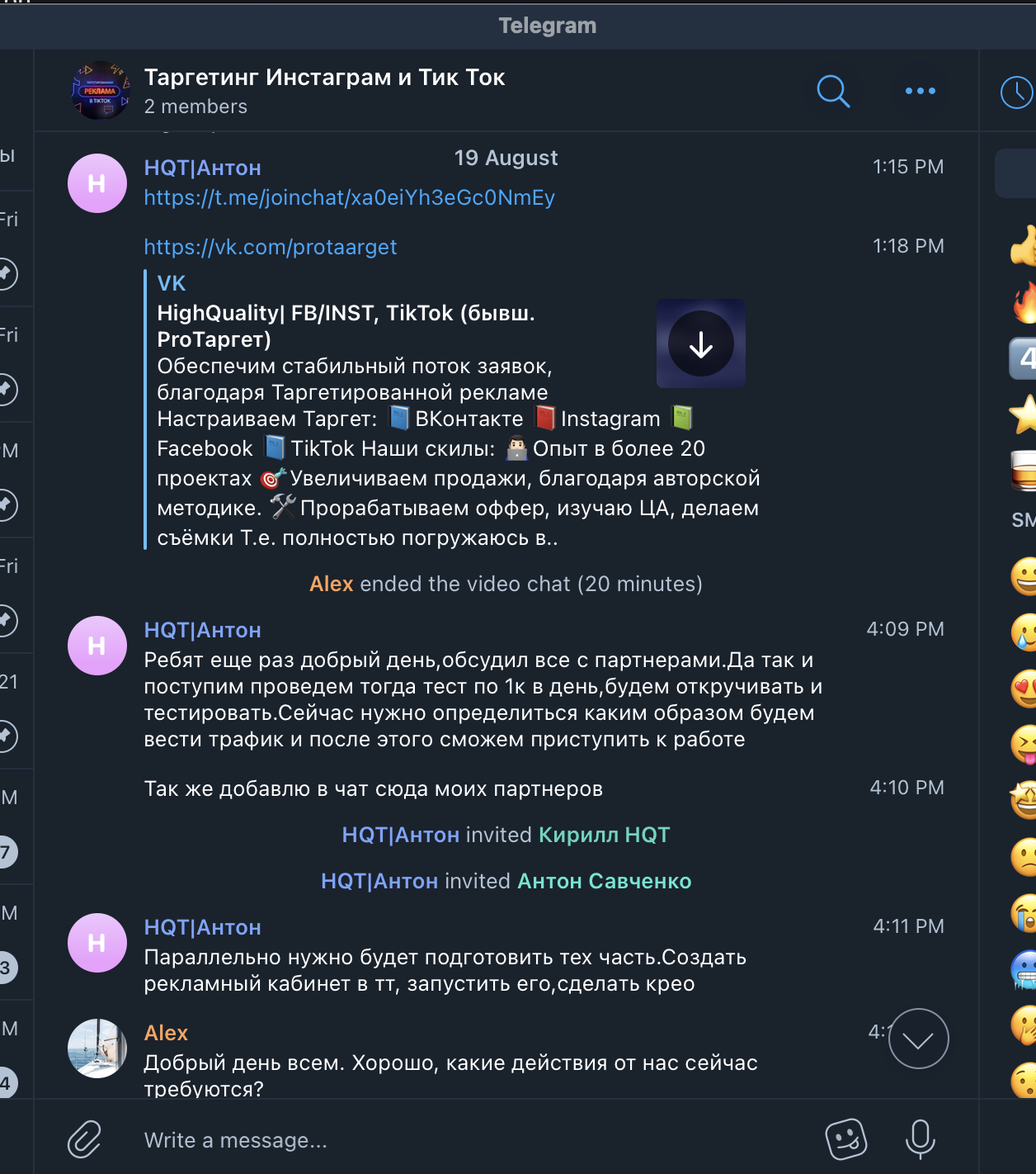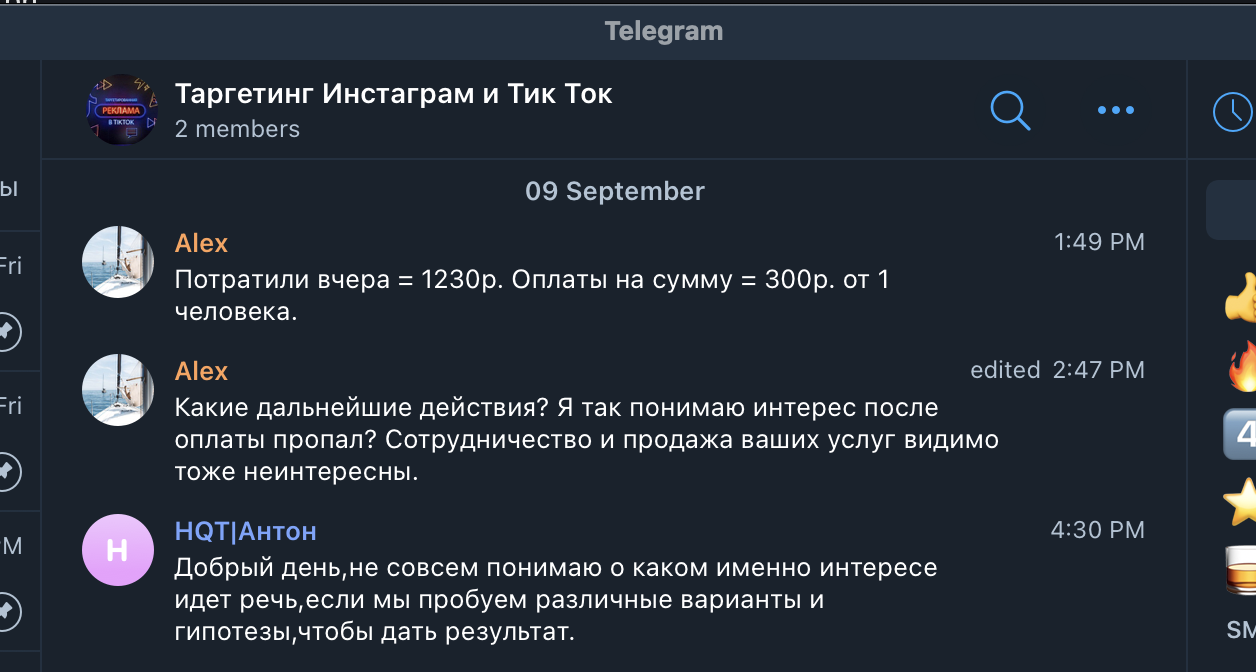 История про мошенников, выдающих себя за ТикТок рекламщиков. В вышеупомянутом чате мы наткнулись на рекламный пост НQT|Антон. У нас действующий и быстро растущий проект и мы уже давно думали нанять спеца по рекламе в Тик Ток. НQT|Антон оказался нормальным человеком, он слышал клиента и говорил правильные вещи, убеждая в том, что мы вроде нашли специалиста.