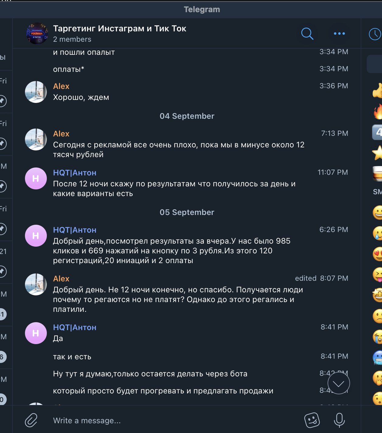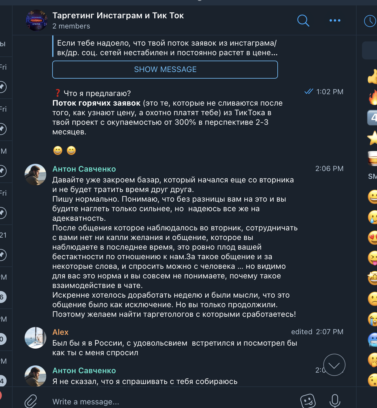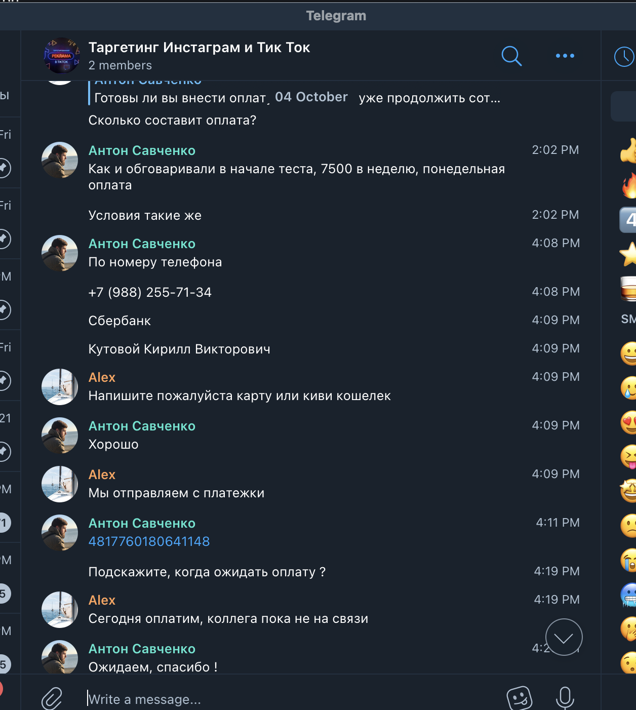 История про мошенников, выдающих себя за ТикТок рекламщиков. В вышеупомянутом чате мы наткнулись на рекламный пост НQT|Антон. У нас действующий и быстро растущий проект и мы уже давно думали нанять спеца по рекламе в Тик Ток. НQT|Антон оказался нормальным человеком, он слышал клиента и говорил правильные вещи, убеждая в том, что мы вроде нашли специалиста.