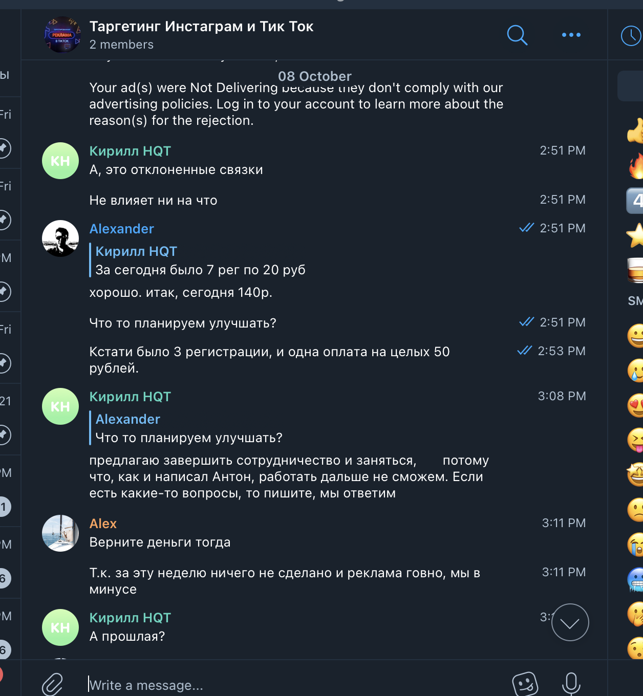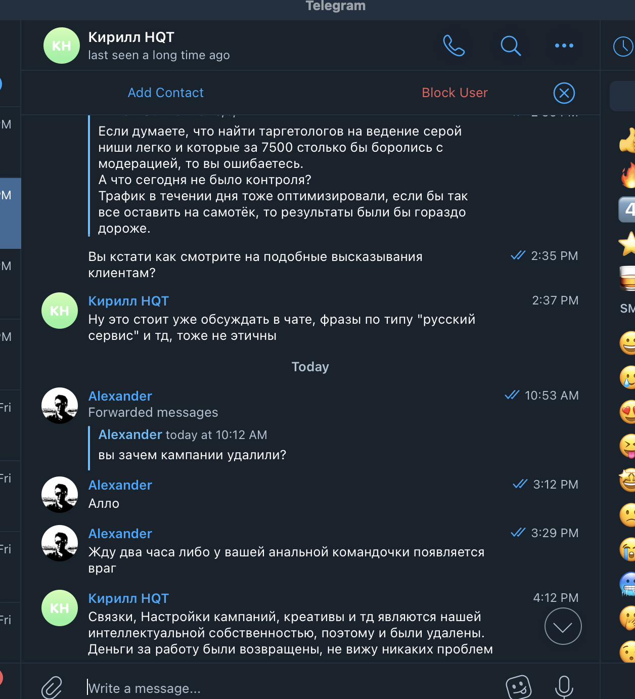 Оплат было 8 или 9, сумма пополнений смехотворна затратам, которые мы несли. Утром я получил ответ в ЛС от их предводителя Кирилла (Кирилл Викторович Кутовой a.k.a. бенефициар, в телеграме Кирилл HQT https://t.me/tsunamiboy, https://vk.com/id607327726). Я надеялся, на то, что хотя бы у начальника хватит мозгов, но мне сказали, что всё в порядке и мы сами дураки, что сравнили их с русским сервисом.