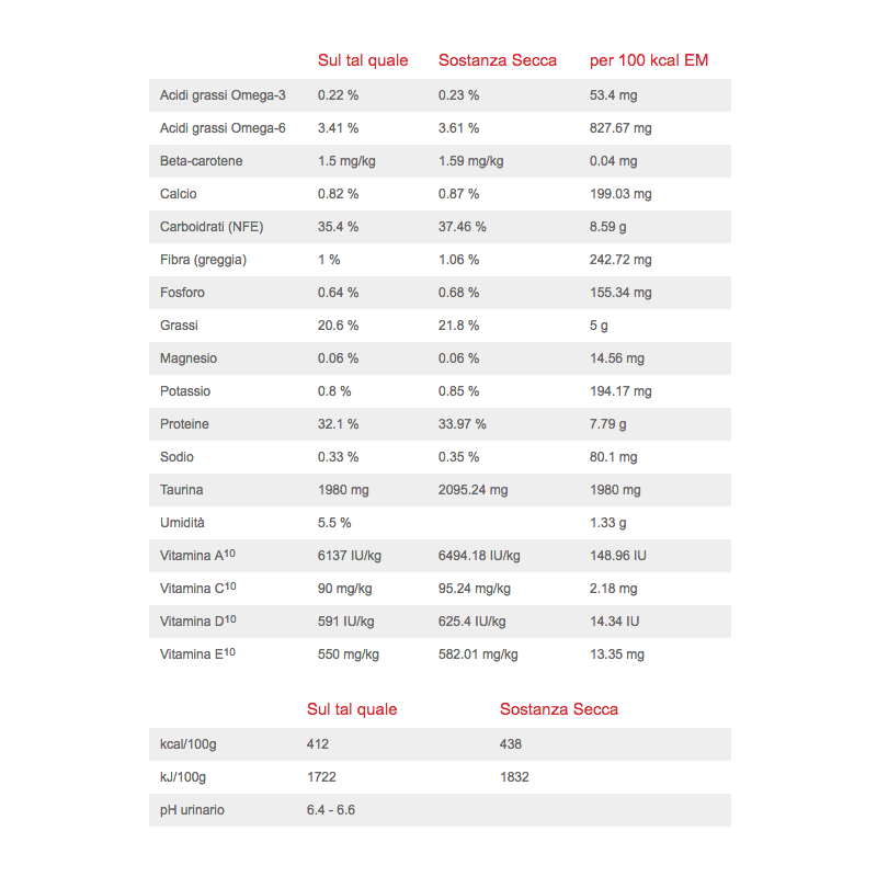 Гарантируемые показатели питательной ценности: белок 30%, жир 10%, клетчатка 2,73%, зола 6,09%, таурин 0,10%, метионин 0,34%, аргинин 1,51%, кальций 1,10%, фосфор 1,10%, натрий 0,23%, витамин А 5000 МЕ/кг, витамин D3 500 МЕ/кг, витамин Е 45 мг/кг, витамин В1 5 мг/кг, витамин В2 4 мг/кг, витамин В3 60 мг/кг, витамин В4 1200 мг/кг, витамин В5 5 мг/кг, витамин В6 4 мг/кг, железо 80 мг/кг, медь 5 мг/кг, цинк 75 мг/кг, йод 0,5 мг/кг, селен 0,1 мг/кг.