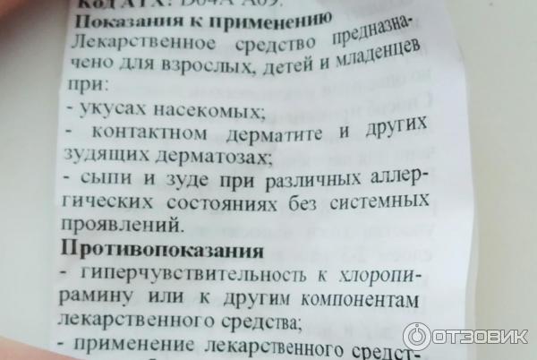 Нет данных о всасывании хлоропирамина через кожу или данных о достижении клинически значимых концентраций в плазме крови при его местном применении на коже с ненарушенной целостностью . Показания к применению Лекарственное средство Хлоропирамин предназначен для взрослых, детей и младенцев при: - укусах насекомых;