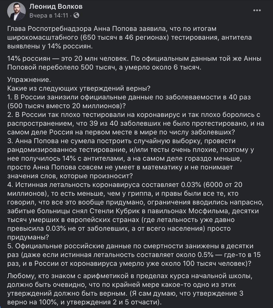 Антона Барчука, Анастасию Новкунскую, Кирилла Титаева, Дмитрия Скугалевского и Юлию Раскину интересовала статистика в Москве и тема серологических тестов, по которым анализируют наличие антител. Выводы о московской статистике изложили в материале "По данным тестов на антитела, коронавирусом переболели 12,5% москвичей. Можно ли этому верить? Это много или мало? А в других странах сколько? Путеводитель по серологическим опросам". Отметим, что А.Барчук является онкоэпидемиологом и исполнительным директором Ассоциации онкологов СЗФО