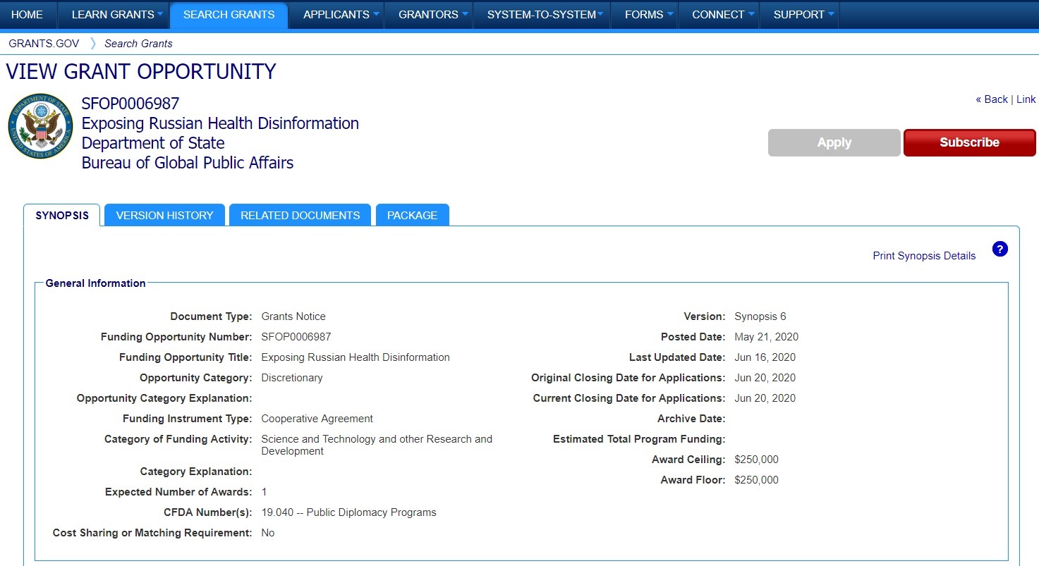 21 мая на сайте, информирующем о грантах государственных органов США, появилось уведомление о гранта от Государственного департамента SFOP0006987 на сумму 250 тысяч долларов за "разоблачение российской дезинформации по вопросам здравоохранения". По неформальной оценке грант обусловлен недоверием за океаном к официальной российской статистике заболеваемости и летальности от COVID-19. На соискание гранта могли претендовать американские и иностранные некоммерческие, коммерческие и научные организации, подавая предложения до 20 июня. Предложения от государственных и муниципальных служащих, а также от частных лиц не принимались