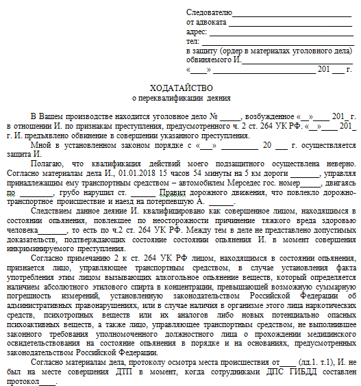 Ходатайство следователю о переквалификации
