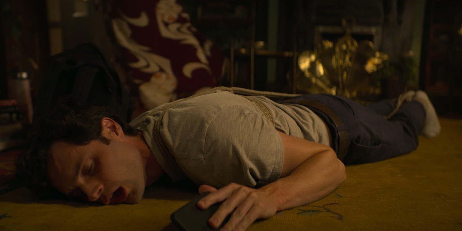 Lorena Garcia in coat bound on sofa squirming in ropes trying to get free :)