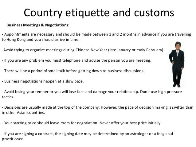 However, this advice is by no means everything to keep in mind . Here are a few more tips concerning Hong Kong business etiquette : Take enough time to get to appointments .The streets in Hong Kong are usually very crowded, and it may take some time to get to your business partner's office . Make sure you won't be late . Punctuality is important!