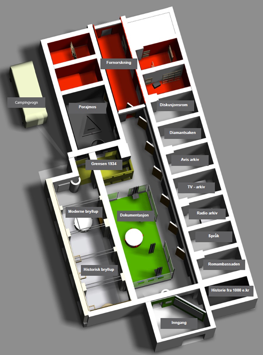 В той части экспозиции, которая посвящена взаимоотношениям норвежских рома с норвежским государством, на стене висят официальные документы 1970-х годов, рассказывающие об истоках создания «Цыганского офиса» (Sigøynerkontoret), действовавшего с 1970-х по начало 1990-х годов. «Цыганский офис» задумывался как комплексный интеграционный проект, в рамках которого рома получали не только жилье, но и крупные выплаты в виде своего рода социального обеспечения. Перед развешенными официальными документами установлена стеклянная табличка, на которой напечатаны цитаты об опыте посещения рома Цыганского офиса. Нормативные акты на заднем плане становятся трудными для чтения, поскольку текст частично скрыт перекрывающим текстом, описывающим опыт применения этого законодательства. Официальный язык, на котором написано законодательство, в сочетании с более разговорным языком в цитатах, ясно показывает взаимное непонимание между государством и рома. «Вы зашли в офис […] и вышли с чеком на 10 000 норвежских крон. Папа все время был против офиса. […] Зачем им искать работу, если они могут так легко получить деньги?».