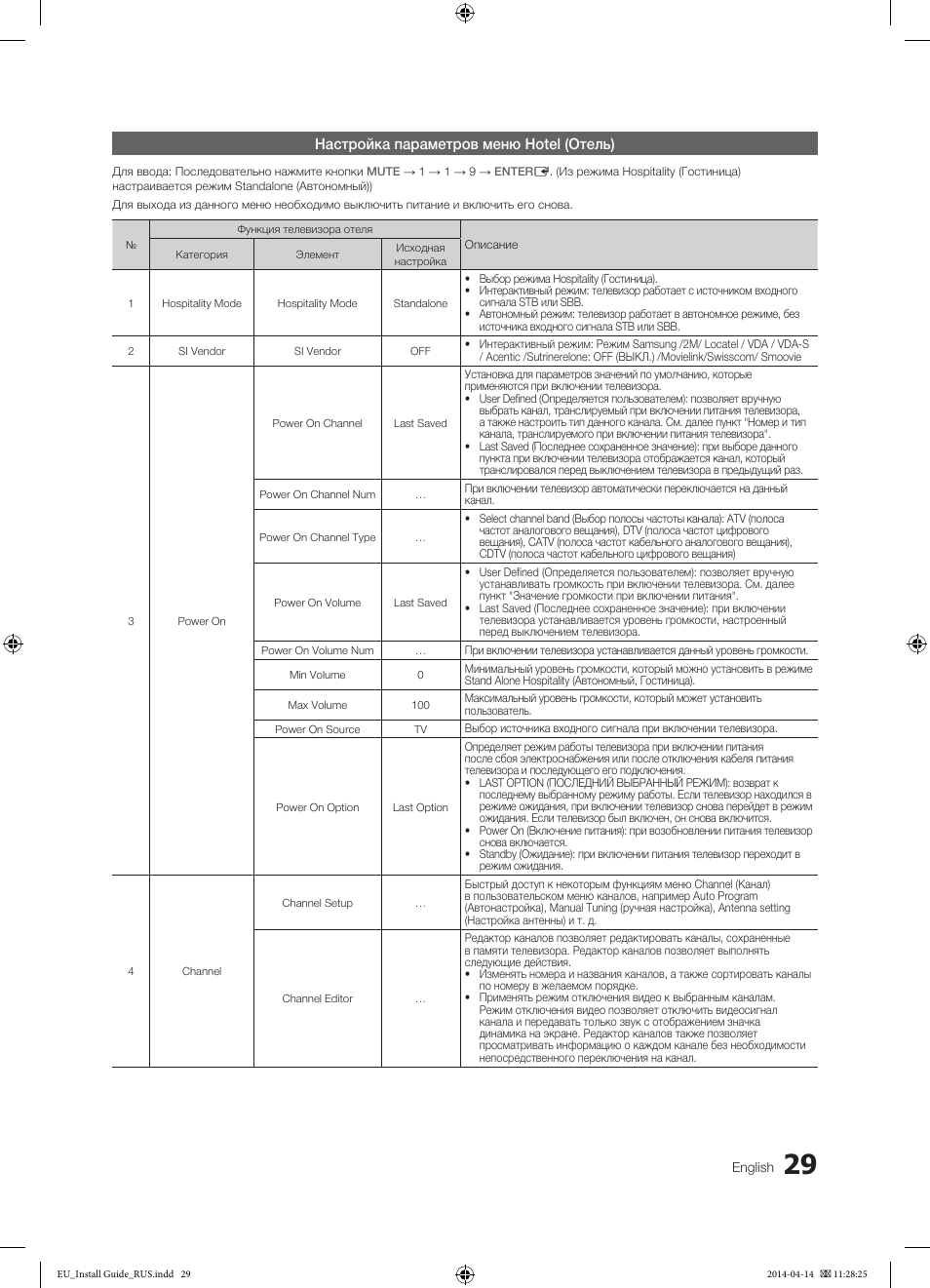 2 . Появится меню, где первый пункт " Hospitality mode " . Нажмите на пульте 1, 2, 3, 4 3 . Появится полноценное меню, поставьте Local Set — EU_RS_AFR 4 . Перейдите в пункт меню "MRT option" 5 . Language Set — CIS 6 . Region — PANEURO 7 . PnP language — Rus 8 .
