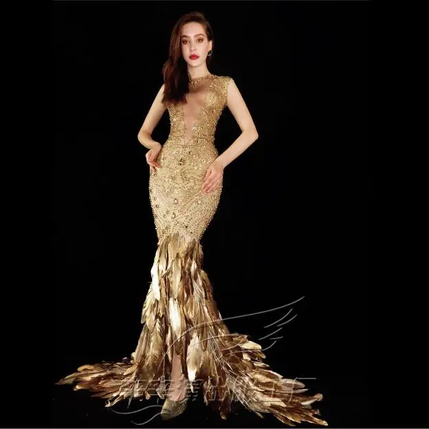 CExaQIpJZHere you can buy Host Dress Luxury Rhinestone Feather Performance Costumes Gold Women Trailing Shiny Singer Stage with free delivery to your post office.