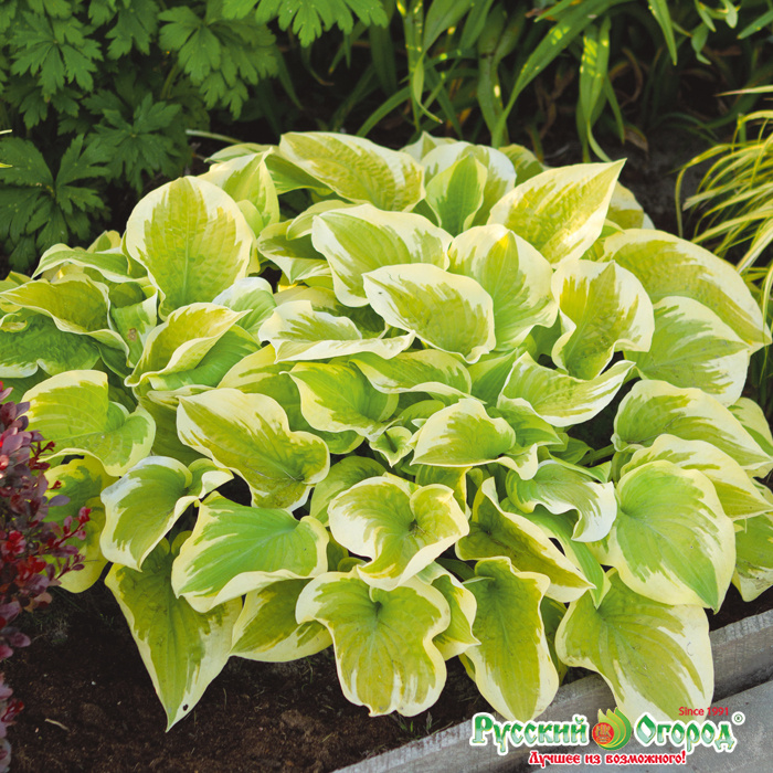 Дельта Дон: эффектная, большая хоста, до 50 см высотой . Листья толстые, оливково-зеленые, с широкой нерегулярной кремовой каймой .