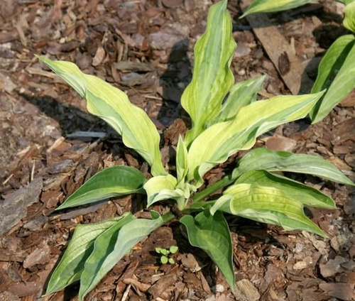 Hosta are among the most popular of perennials for shady areas, with hundreds of varieties now readily available. Plants form a sturdy mound of foliage, topped with lily-like blooms. This small selection has cupped, green leaves with bright yellow margins, dark green centres and white streaks in between. Margins become apple green in summer and the leaves flatten out. Sport of H. ‘Striptease’. Lavender flowers appear in summer. Suitable also for planting in mixed containers or tubs. Hosta go completely dormant in the fall, and the dying foliage can be removed any time before mid spring. Easily divided in either spring or fall, but plants may be left alone for years.