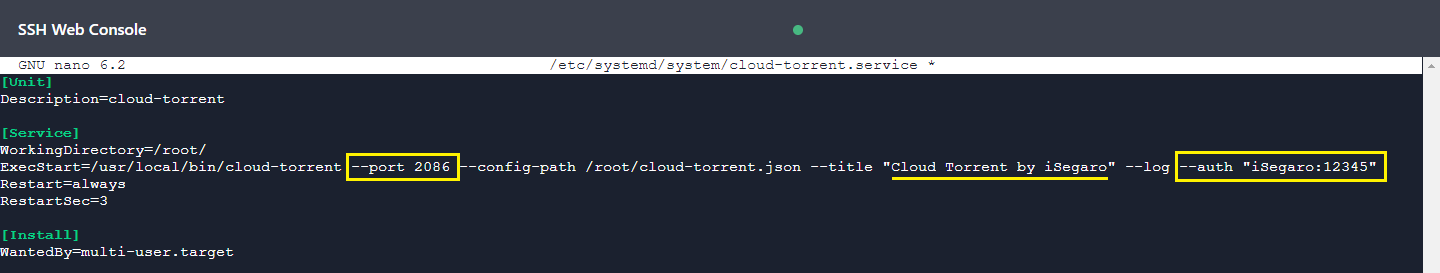 ExecStart=/usr/local/bin/cloud-torrent --port 2086 --config-path /root/cloud-torrent.json --title "Cloud Torrent by iSegaro" --log --auth "user:password"