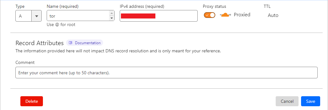 سریع همینجا هم رفتم یه ساب دامین ساختم و پروکسی کردم به ای پی سرور روی کلادفلر (رکورد از نوع A و پروکسی شده به ای پی سرورم با اسم Tor مثلا شما هر اسم دیگه میتونید بزارید)