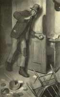 Pretty soon after this a long cadaverous creature, with lanky locks hanging down to his shoulders, and a week's stubble bristling from the hills and valleys of his face, darted within the door, and halted, motionless, with finger on lip, and head and body bent in listening attitude. No sound was heard. Still he listened. No sound. Then he turned the key in the door, and came elaborately tiptoeing towards me till he was within long reaching distance of me, when he stopped and, after scanning my face with intense interest for a while, drew a folded copy of our paper from his bosom, and said: