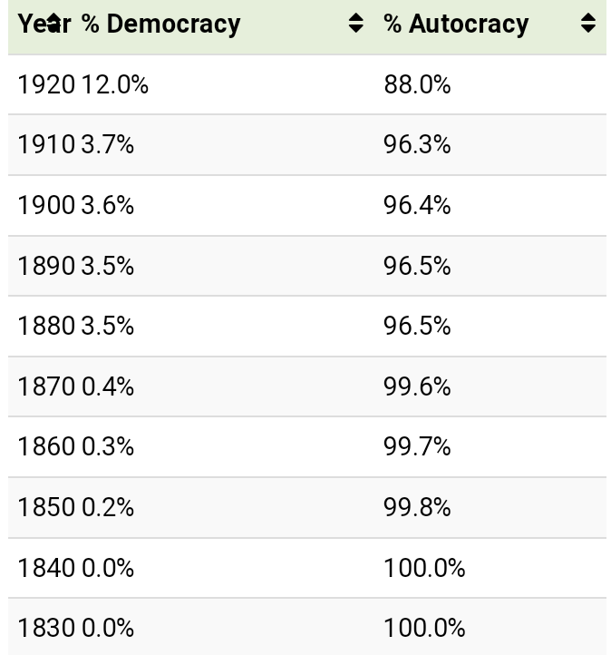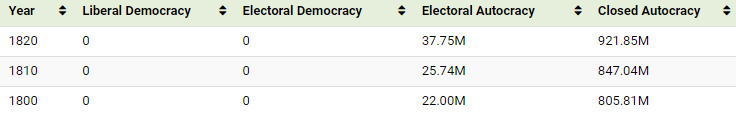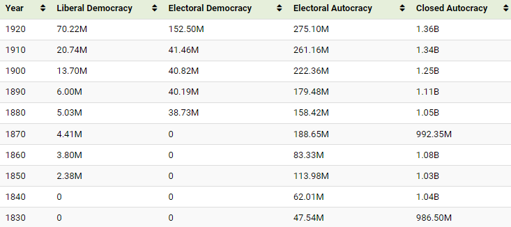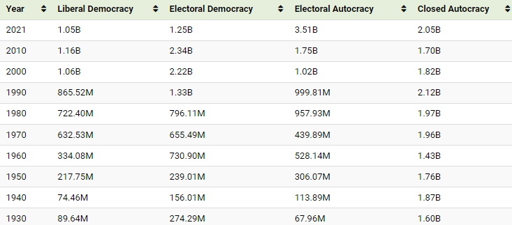 Following both World Wars, the number of democracies in the world increased, spreading across Europe, Latin America, and parts of Asia. After the Cold War, countries across Eastern Europe also adopted democracies, with the total populations shown in the table below: