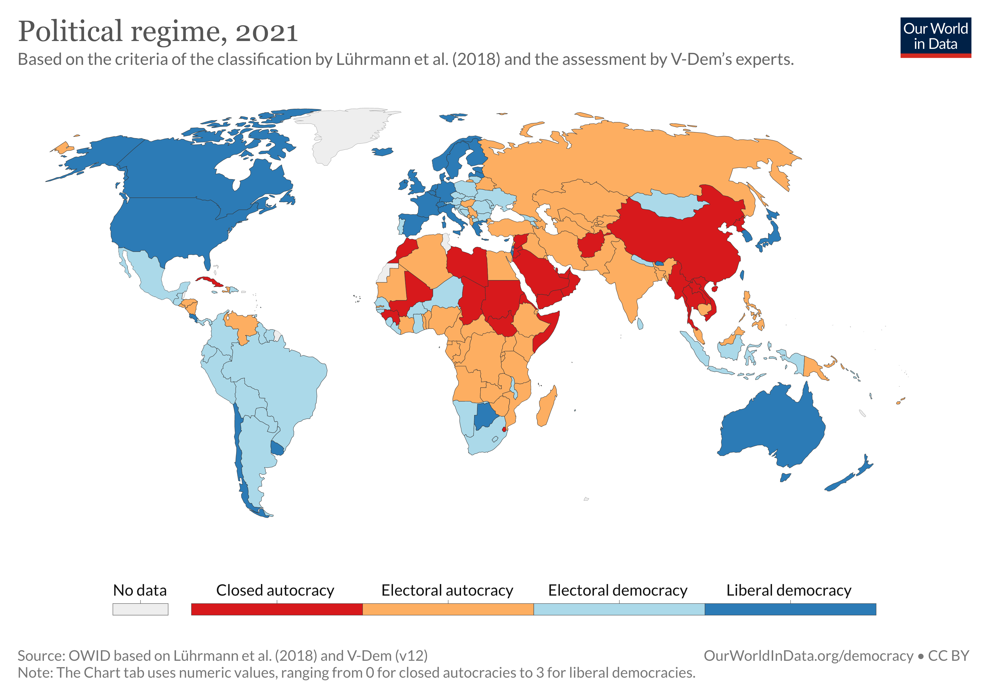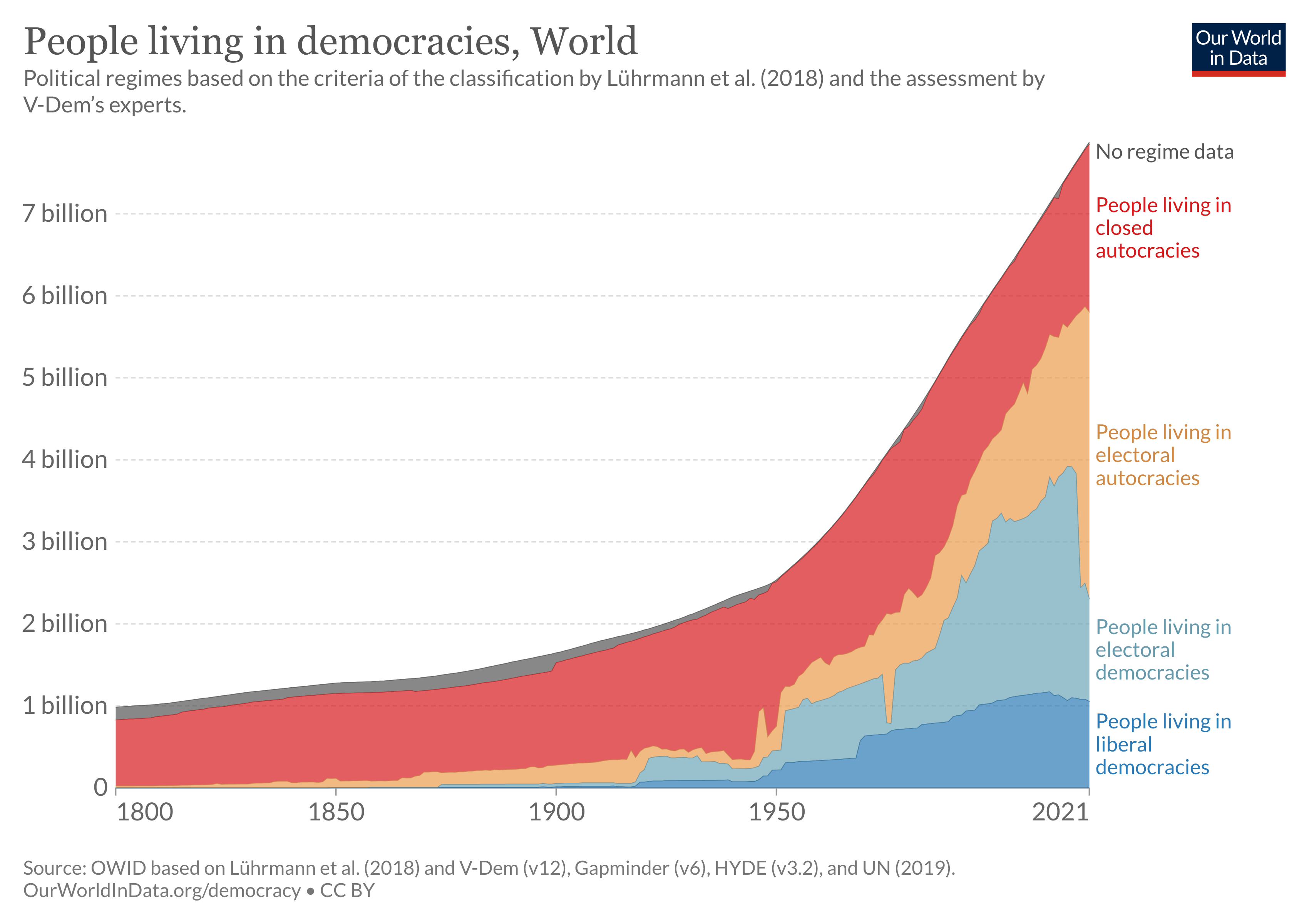 Using the Regimes of the World classification system developed by political scientists Anna Lührmann, Marcus Tannenberg, and Staffan Lindberg and data from V-Dem, it’s estimated that 2.3 billion people—about 29% of the global population—lived in a democracy in 2021.