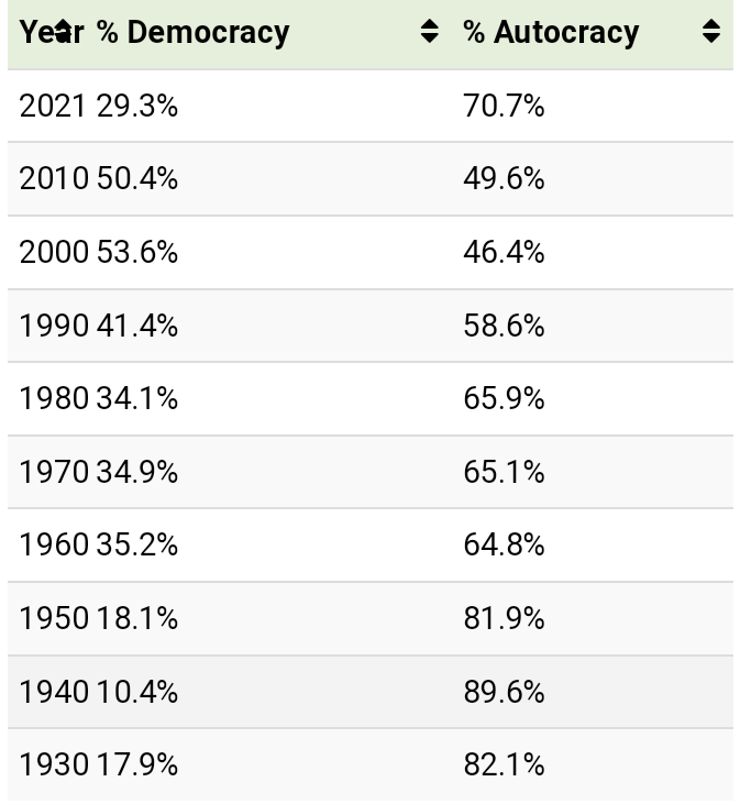 On the flipside, it’s estimated that 5.5 billion people live in autocratic countries.