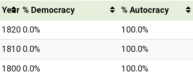 According to the data, liberal democracies and electoral democracies only emerged in Switzerland and Australia in the 1850s and in France in the 1870s after the Franco-Prussian war.