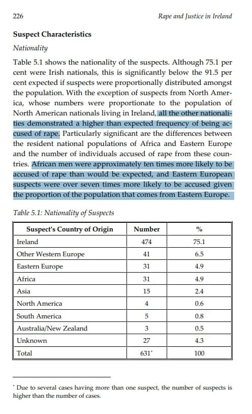 A 2009 Rape Crisis Centre study reported "African men were approximately ten times more likely to be accused of rape than would be expected, and Eastern European suspects were over seven times more likely to be accused given the proportion of the population that comes from Eastern Europe."