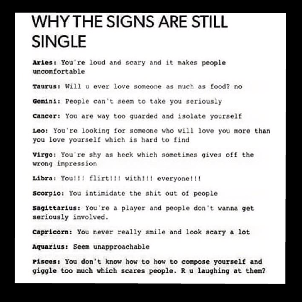 But Libras DO care, about a lot of things. Just don’t expect them to come right out and tell you what’s on their mind. If a Libra looks pensive during your date, it could be about anything – from the food, to their upcoming dentist appointment, to pondering the lyrics of Pharell’s “Happy” – whereas if a Scorpio is pensive during a date, it’s probably because they’re wondering why you haven’t had sex with them yet. (Scorps, I kid. I kid because I’m one of you. Cheers.)