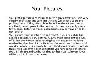 Here are a few tips that might help you get a guy's attention online . Your profile photo . Whether it's a dating site, Facebook or an instant messenger, select a photo that will grab him .