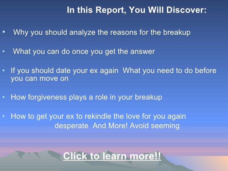 Begin dating each other like two new people meeting and getting to know each other for the first time . This why my book is called " Dating Your Ex " and not "Get Your Ex Back" . It's the same person you dated before but now you are starting a new relationship . 3 . Bring something new to the table .