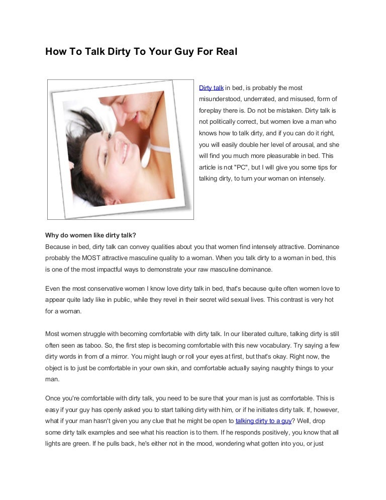 The truth of the matter is, learning how to talk dirty to a guy is very simple, and it doesn't take years and years of practice or experience to do it correctly . And just to clear up a big misconception, there is NO "perfect thing to say" . There is no magic sentence or line; it all works together and must flow naturally .