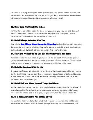 Learning each other's love languages might be a great place to start . 8 . You get a sneak peek of his future . If you're dating an older man , you don't have to worry about what he'll look like when . . .