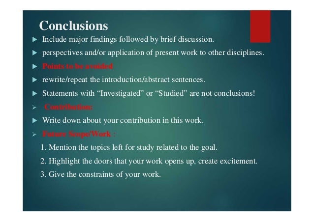 Don't repeat results . Order simple to complex (building to conclusion); or may state conclusion first . Conclusion should be consistent with study objectives/ research question . Explain how the results answer the question under study . Emphasize what is new, different, or important about your results .