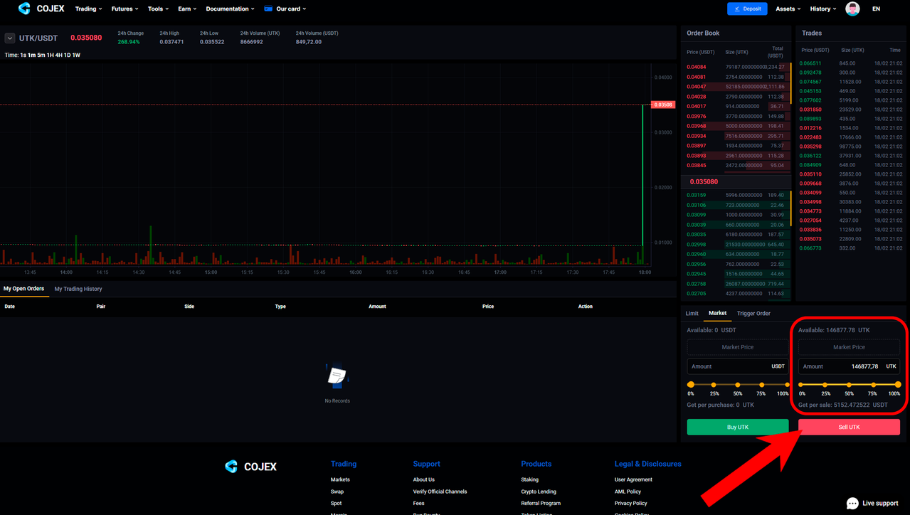 When you see the "SELL COINS" message, go to the "SPOT" tab and check the chart for the coin you want. The indicator and the price should rise. This means that the pumping process has begun, and you can sell the coin.
