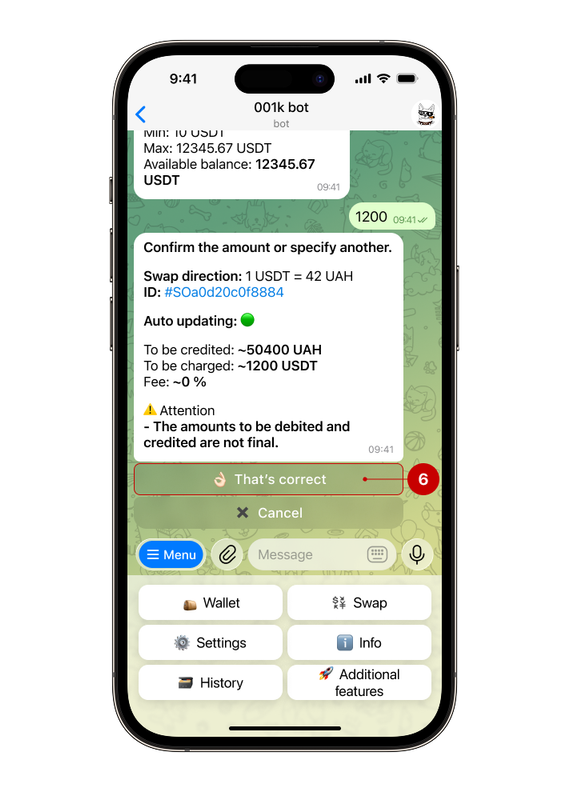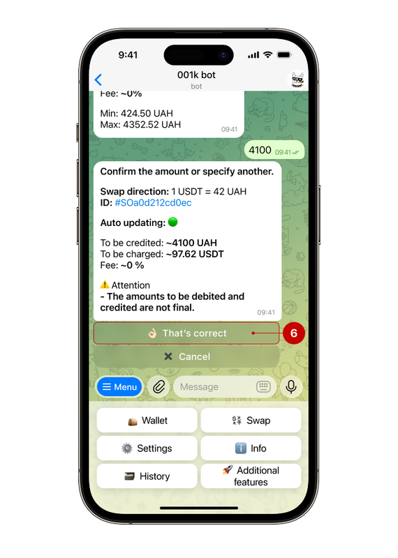 Please check the information provided before confirming. Click the “That's correct” (6) button to complete the exchange. After confirming the transaction, you will receive a notification about the status of your current request.
