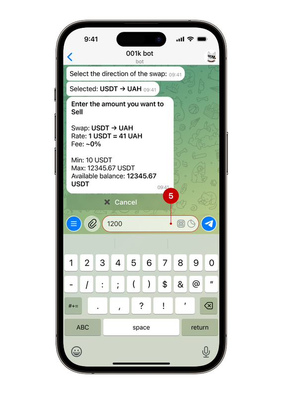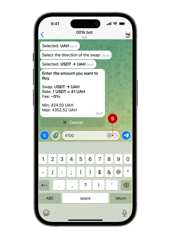 The bot will display the current exchange rate and fee — consider them when calculating.